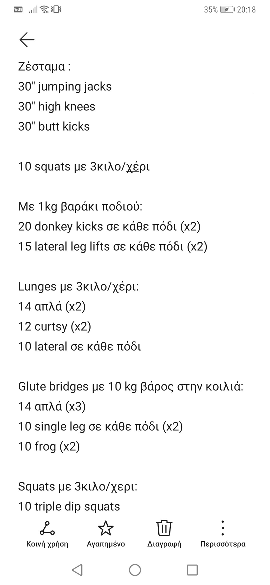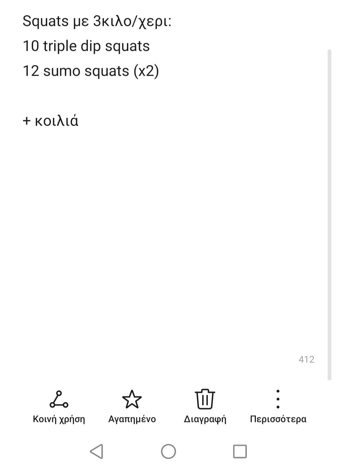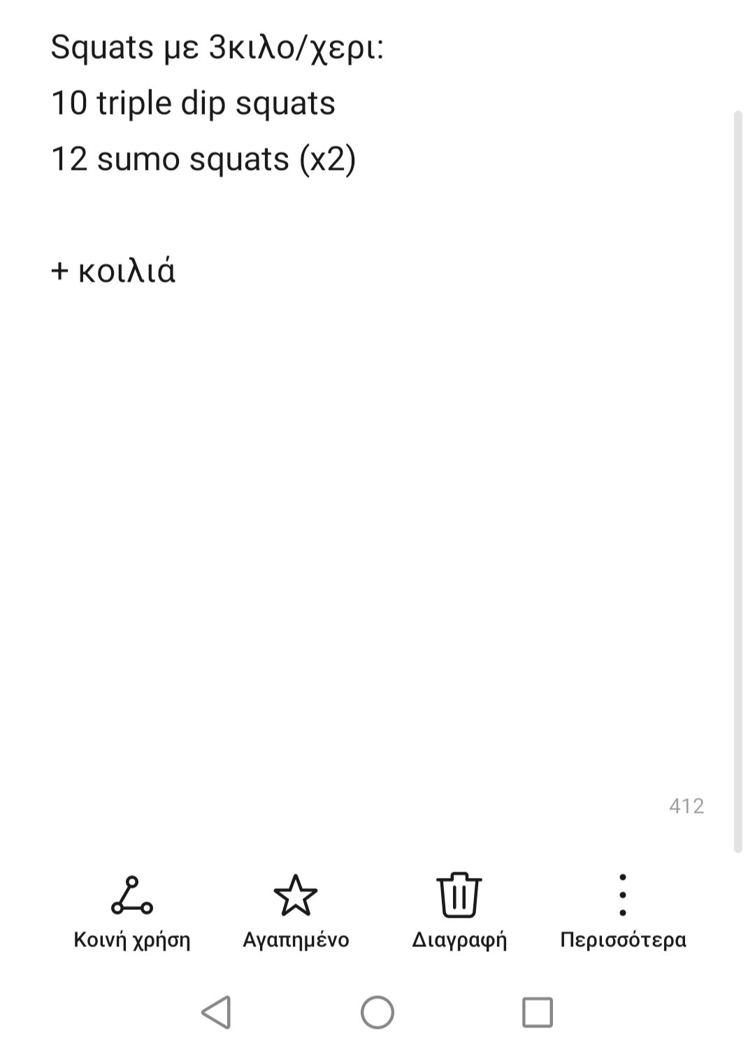 Όταν λέω κοιλιά εννοώ 50 κοιλιακούς με σήκωμα ποδιών (τεντωμένα) χωρίς σετ (όσο αντέξω και μετά σταματάω για λίγο) συν 3 σετ των 15 Russian twists. Εντάξει, δε θα πω ψέματα, επειδή έβγαλα το πρόγραμμα σε περισσότερη ώρα απ ό,τι παλιά και είχα ήδη κουραστεί, έκοψα ένα σετακι