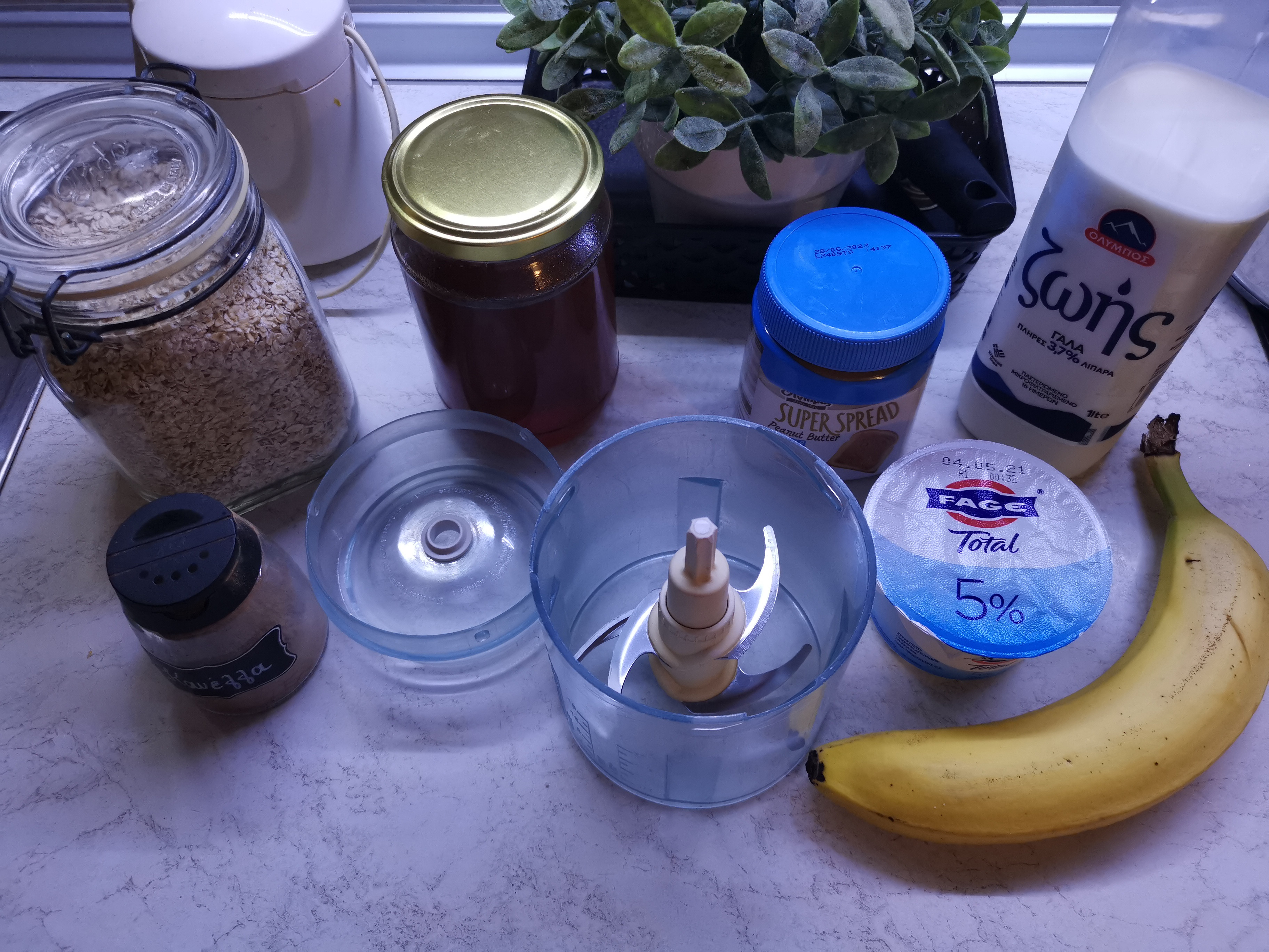 1 μπανάνα (κανονικά την καταψυχω πρώτα για έξτρα μιαμ), μισό κεσεδακι γιαούρτι πλήρες, 2 πολύ γεμάτα κ.γ. φυστικοβουτυρο, 1 κ.γ. μέλι, 4 κ.γ. βρώμη και συμπληρώνω το γεμάτο μουλτι με γάλα μέχρι τα 300 mL μαζί με λίγη κανελιτσα για γεύση. Όλο μαζί πρέπει να γεμίζει ένα ποτήρι μεγάλο (περίπου 500mL) κι έχει γύρω στις