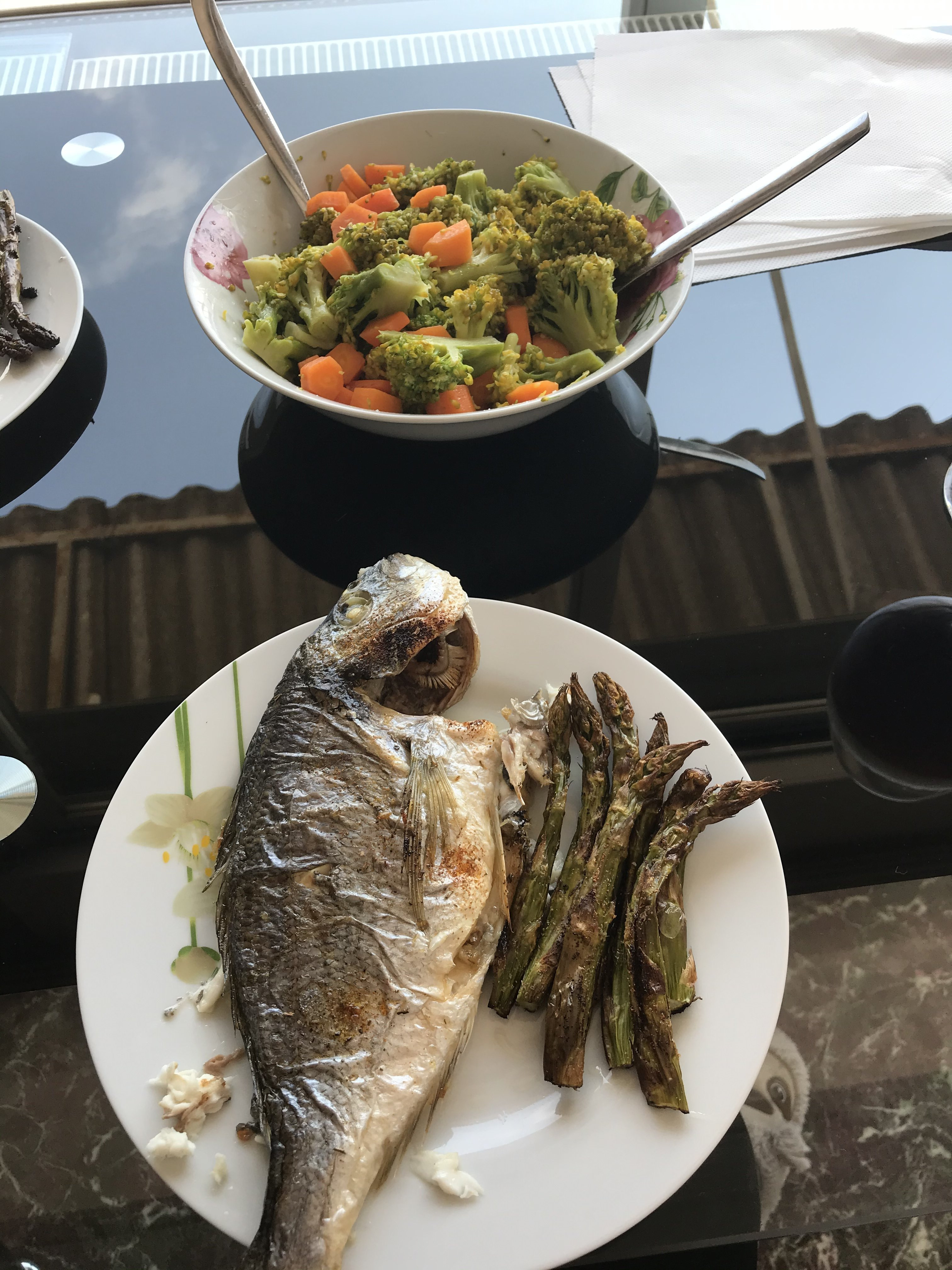 Ψάρι με σπαράγγια και σαλάτα μπρόκολο+ καρότα.