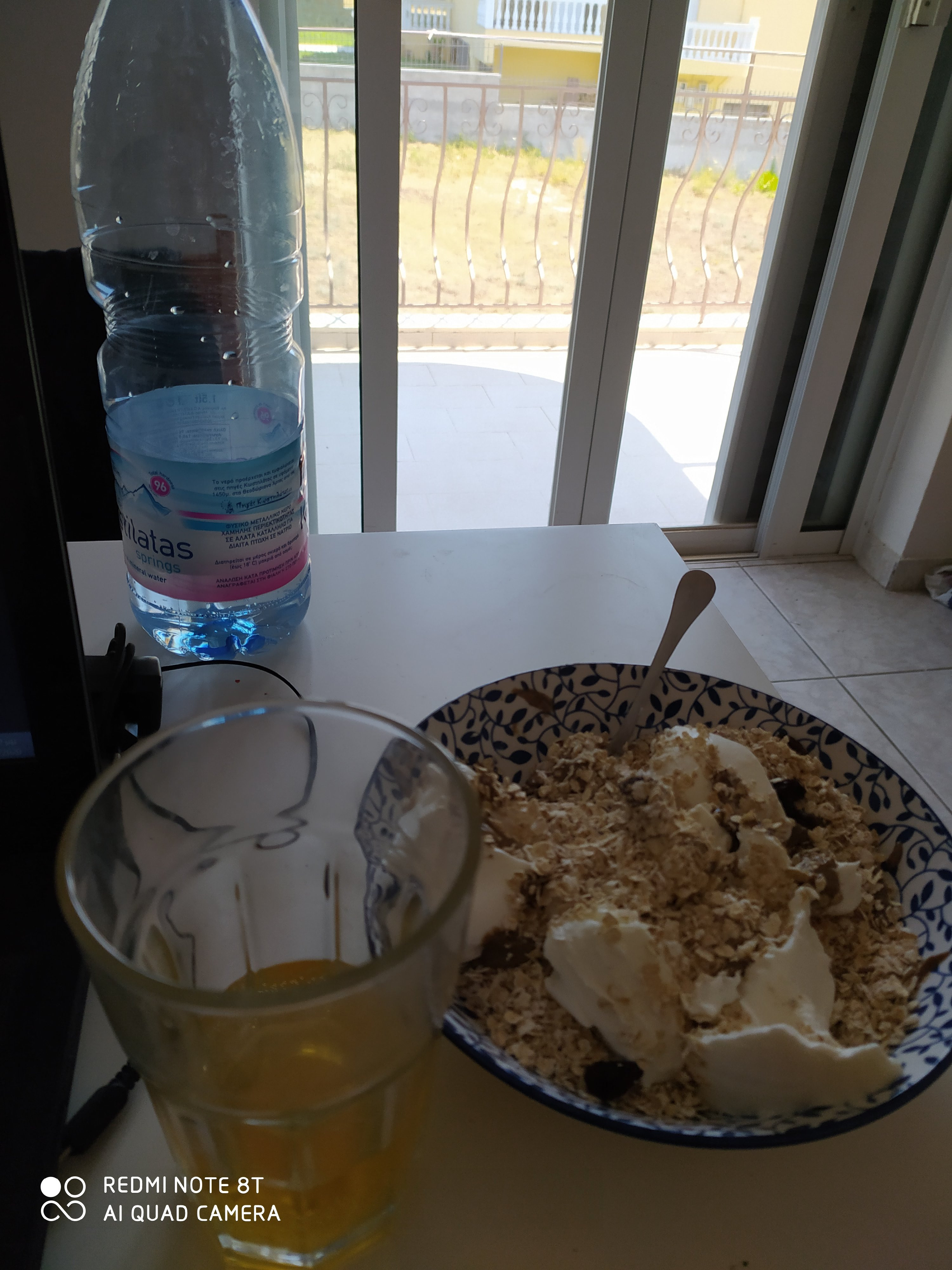 γιαουρτι-ταχινι-καρυδια-σταφιδες-κουάκερ. Τ κιτρινο υγρο ειναι βιταμινή C ! 930 θερμιδες