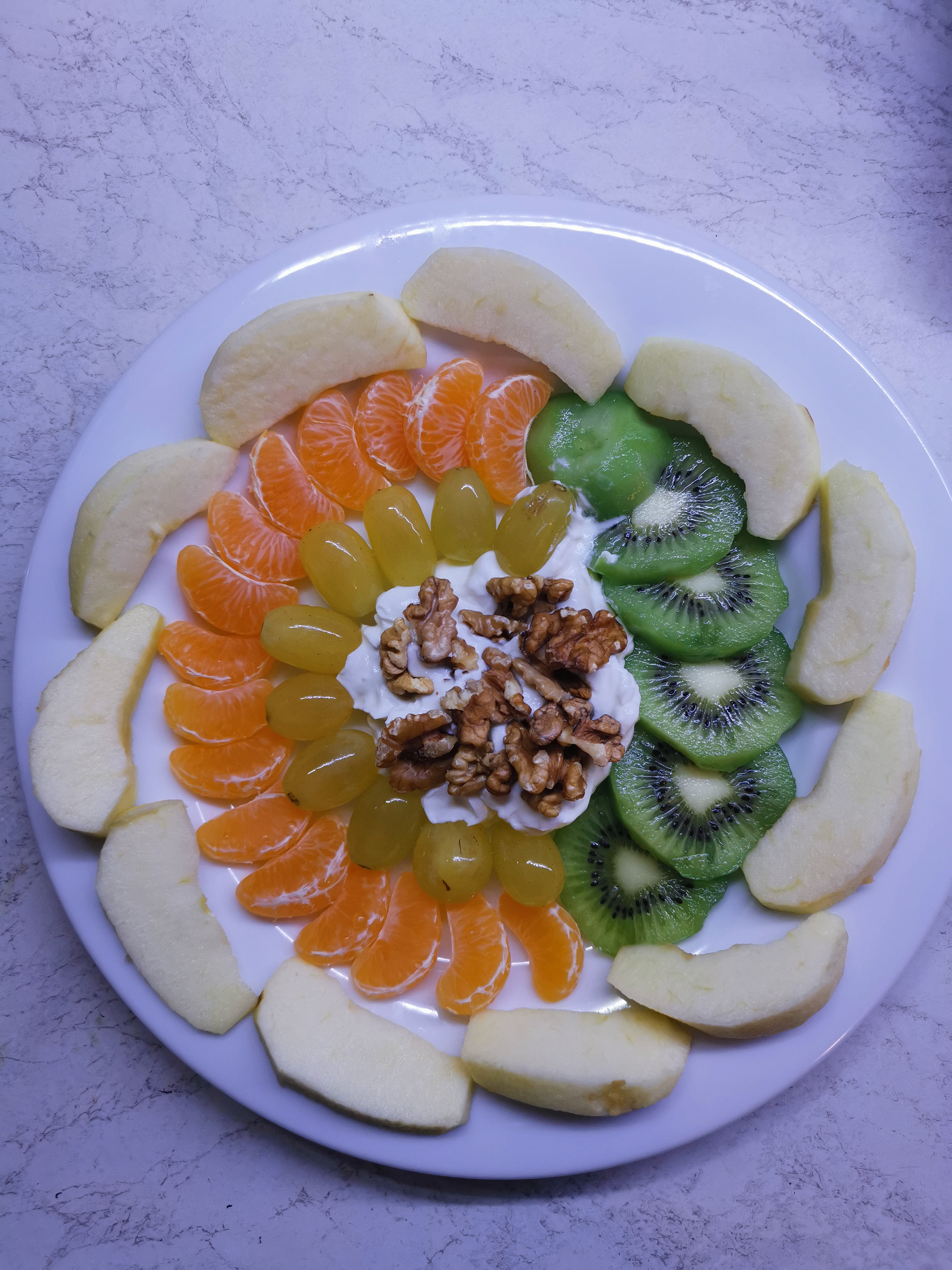 1 μήλο, 1 ακτινίδιο, 2 μανταρίνια, λίγο σταφύλι, μισό κεσεδακι γιαούρτι 2% και λίγα καρύδια. Αυτό το ανεβάζω για να το δει κι ο @dum dum boy. Αντί να φας 2 φρούτα, είναι προτιμότερο να φας 1 φρούτο με γιαούρτι και ξηρούς καρπούς. Έτσι συνδυάζεις υδατανθρακα - πρωτεΐνη - (καλά) λιπαρά.