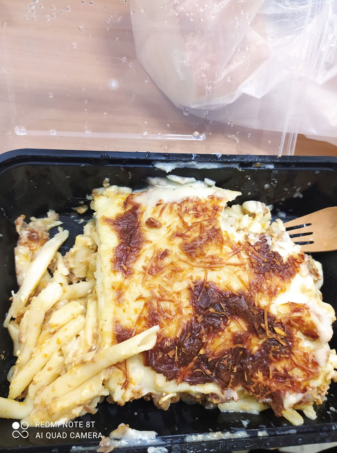Σημερα εχει φαγητο παστίτσιο... πήρα 2 μερίδες (οχι για μένα) και άνοιξα τη μία για να δοκιμάσω λίγο απο την άκρη. Έφαγα ελάχιστα να δοκιμάσω γιατι αν έτρωγα ολο αυτο το θηρίο πάει η προπόνηση σημερα και θέλω πολύ να κάνω !