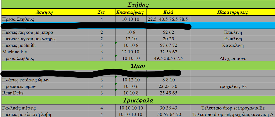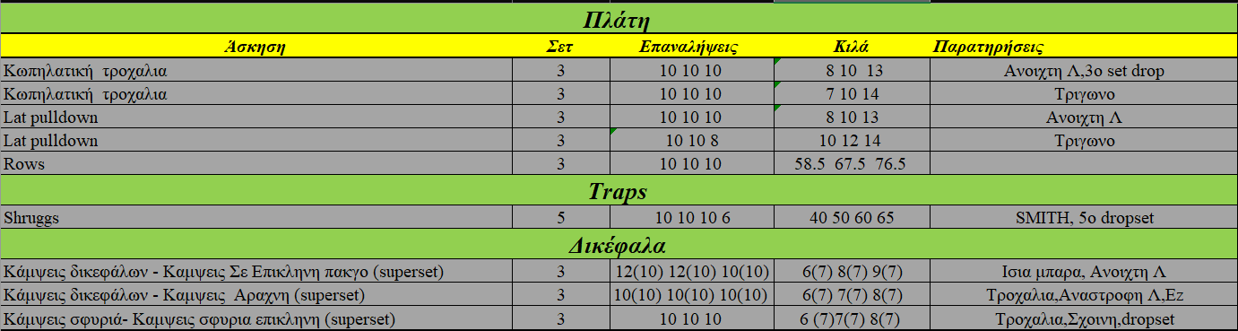 ,βαζω το προγραμμα πως εξελιχτηκε και μετα ακολουθει το σπιτικο που κανω τωρα,διατροφη ,και εικονες.Στην αρχη για 3 εβδομαδες ηταν πιο απλοικο ,καθως προσαρμοζομουν να δω τι μου αρεσει και τι οχι ,που πρεπει να ανεβω και που οχι .Το τελικο ειναι το παρακατω ,δεν ειναι στοχευμενο υπερτροφιας ,ειναι μικτο μιας και τα τελευταια σετ περιπου στοχευαν σε δυναμης (οσο μπορουσα). Φυγαμε